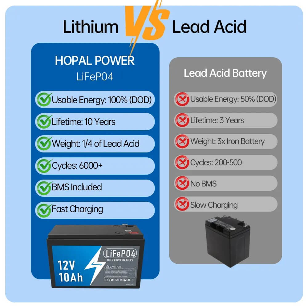 ऑल इन वन टेक्नोलॉजी की लिथियम आयरन फ़ॉस्फ़ेट (LiFePO4) बैटरियाँ लंबे समय तक चलने वाला प्रदर्शन, उन्नत सुरक्षा और उच्च ऊर्जा दक्षता प्रदान करती हैं। 6000 से ज़्यादा चार्ज साइकल और बिल्ट-इन बैटरी मैनेजमेंट सिस्टम (BMS) के साथ, हमारी बैटरियाँ बेहतरीन विश्वसनीयता और सुरक्षा प्रदान करती हैं।
